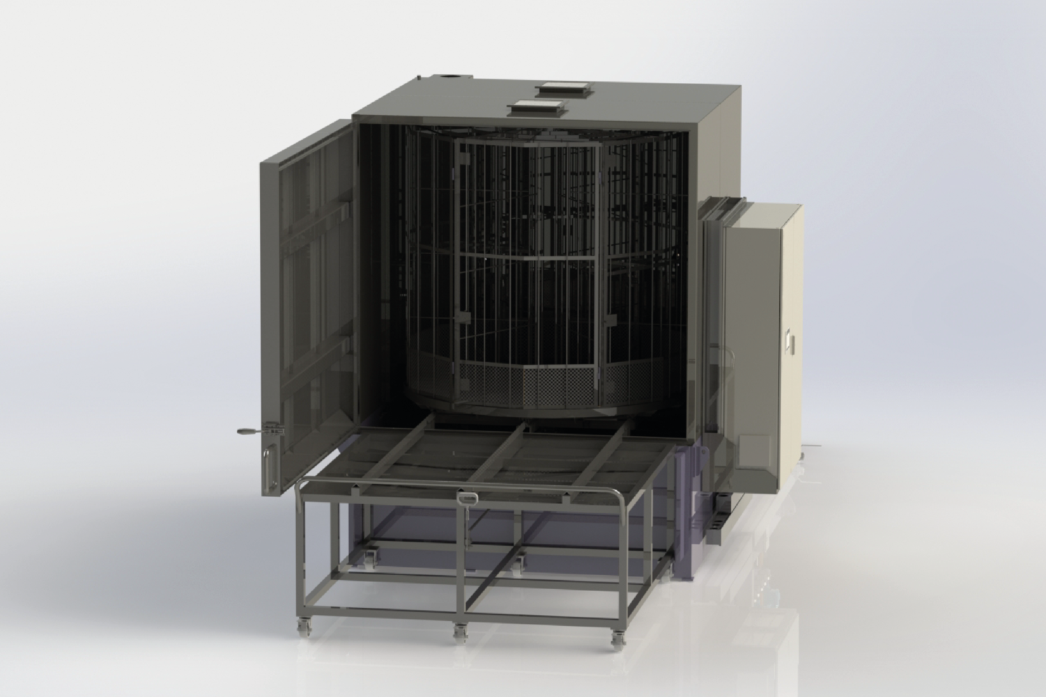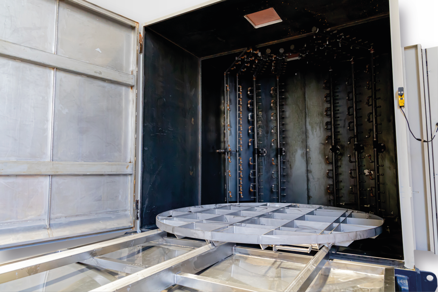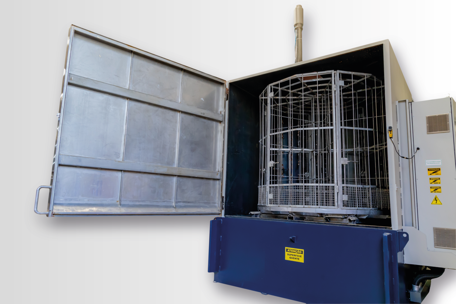 Construção Heavy Duty em Aço Carbono, possui mesa rotativa com alta capacidade de carga. A porta, carrinhos, cestos e bicos em Aço Inox.