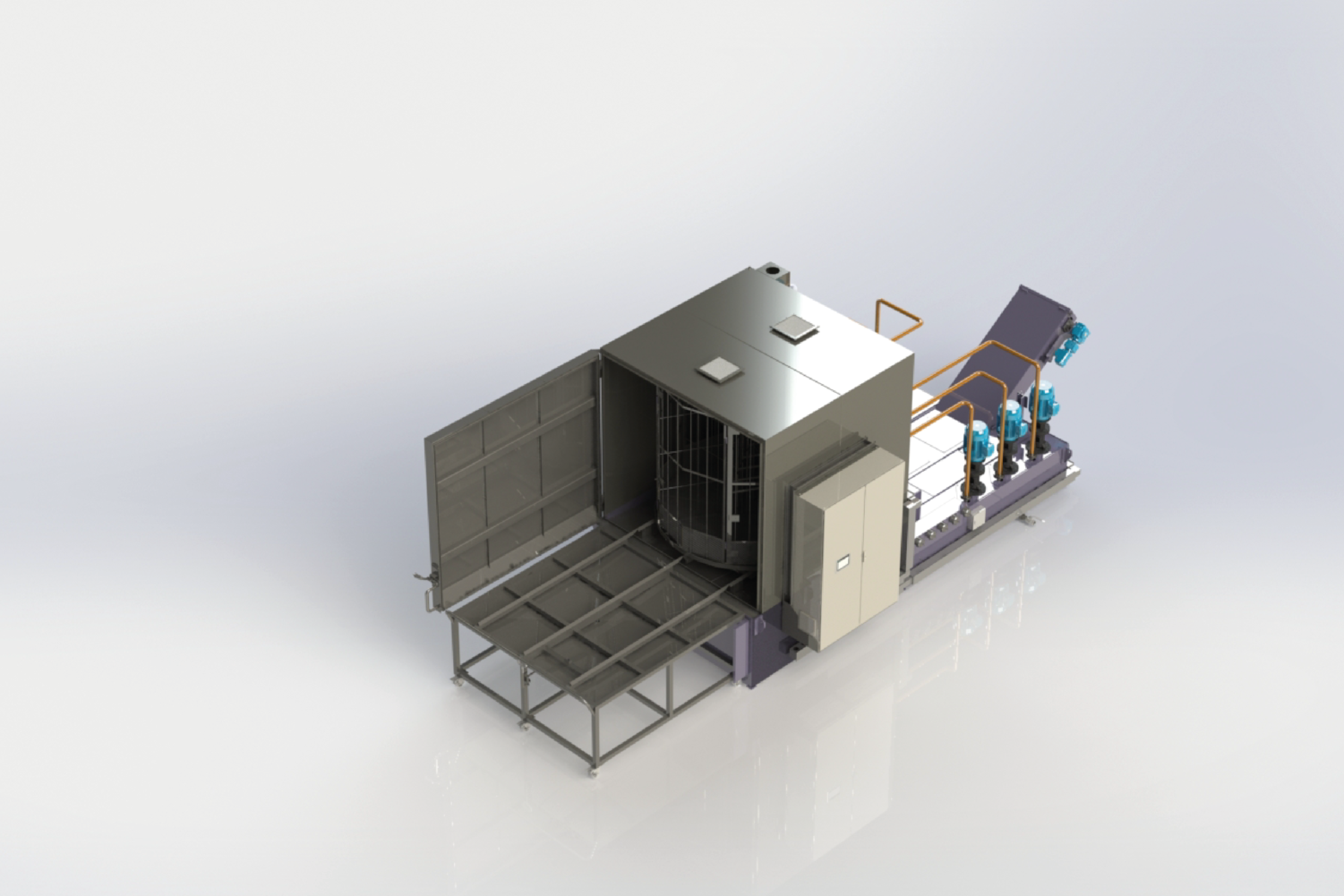 A Carga e Descarga será feita através de 2 carros móveis com dispositivo em aço inox. Enquanto 1 cesto/dispositivo estiver sendo lavado, o outro estará sendo carregado/descarregado ao mesmo tempo.