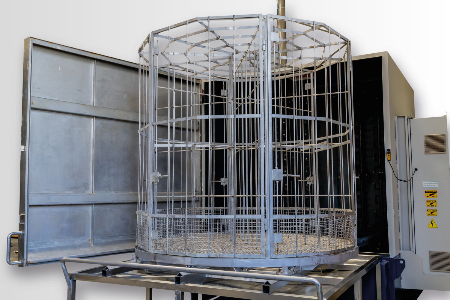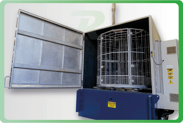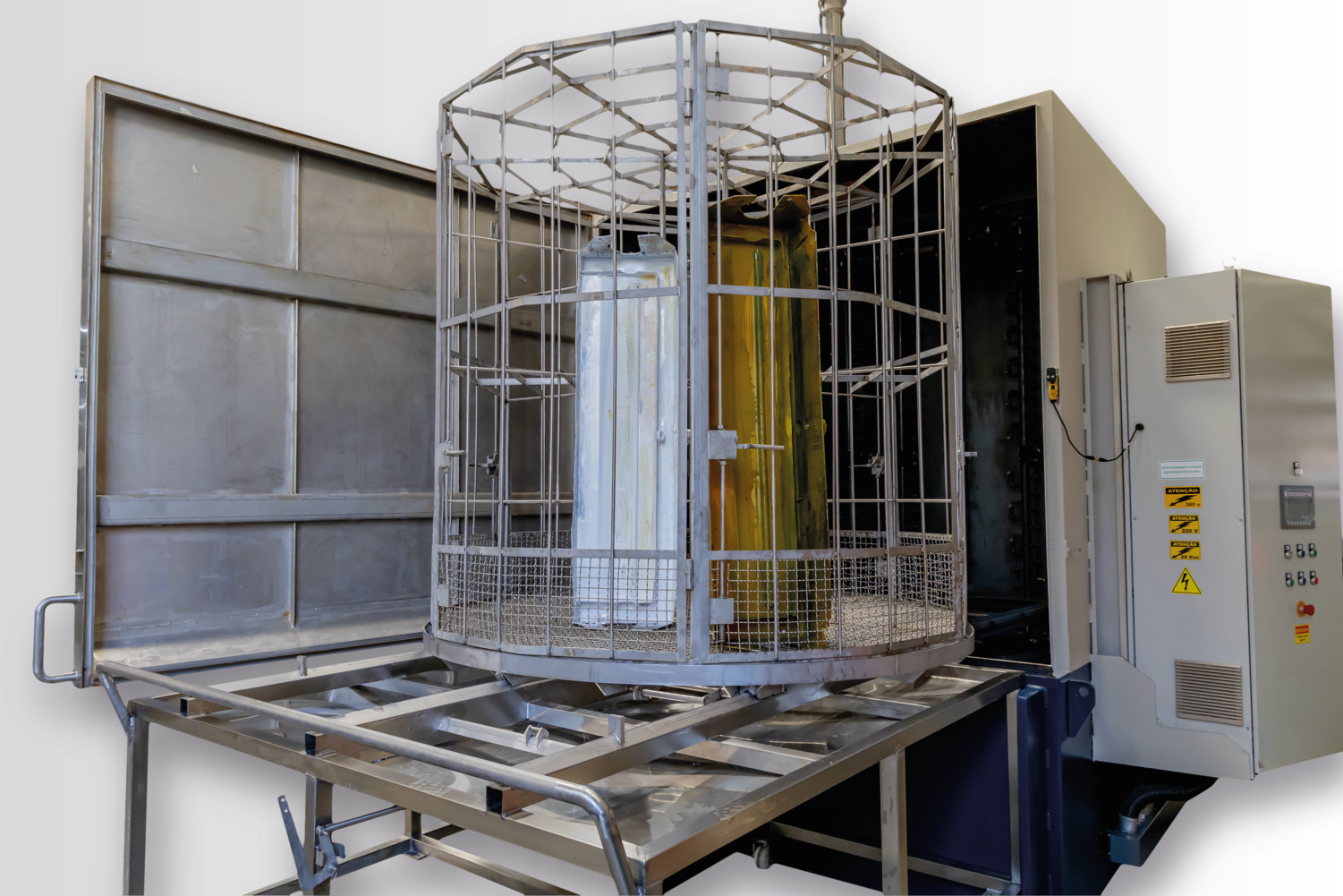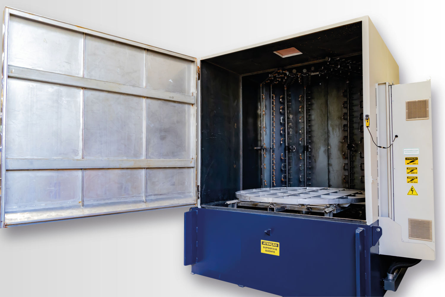 Construção Heavy Duty em Aço Carbono, possui mesa rotativa com alta capacidade de carga. A porta, carrinhos, cestos e bicos em Aço Inox.